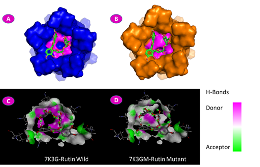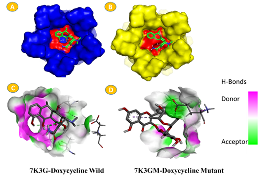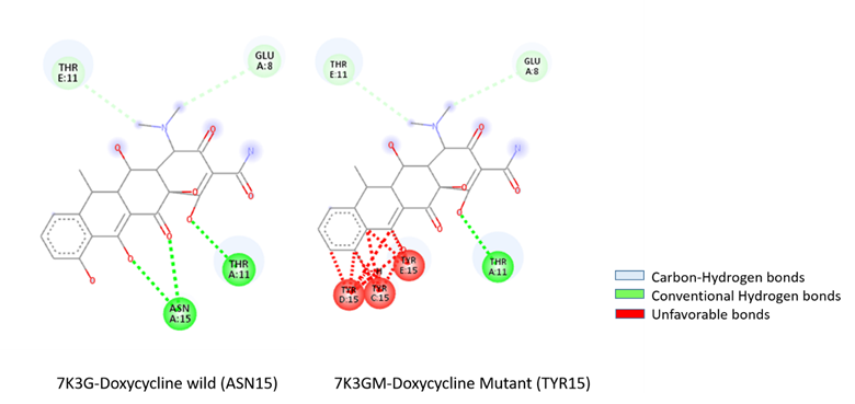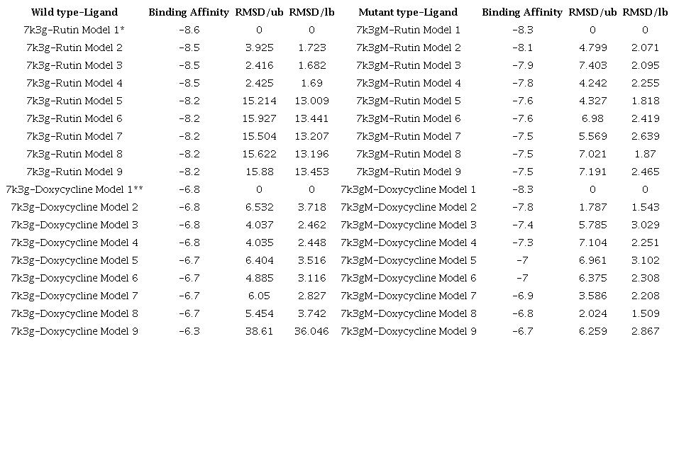 According to our findings, the docking of the doxycycline revealed the presence of additional connections in the mutant position and a rise in the degree of fusion. This may call attention to the possibility that doxycycline has a direct effect on the virus by enhancing its binding to the E protein. The effect of the mutation was proven in the case of rutin by altering the ligand-protein binding site, which is also helpful in practice.18