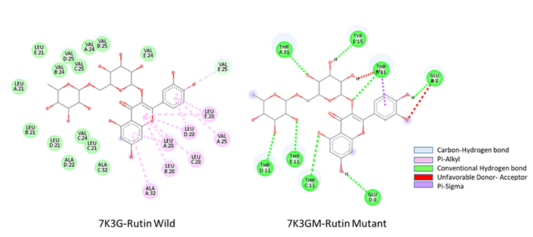 According to the 2D structure of (7K3G-Doxycycline), the main interacting residues in the E protein are GLU8, THR11, and ASN15 for the wild type. The resultant mutant type (7K3GM-Doxycycline), in which the amino acid asparagine was replaced with tyrosine, shows a shift in the degree of contact. It possesses an unstable bond link, but one with greater energy than in the wild type, and the fusion now encompasses the residues GLU8, THR11, and TYR15, as seen in Figure 3. VAL25, LEU28, and ALA32 are the major interacting residues in the wild type (7K3G-Rutin). On the other hand, the interaction between residues of mutant strain (7K3GM-Rutin) resulted in a significant alteration in the docking site. The interacting residues (GLU8, THR11, and TYR15) share the same interaction with a mutant type of the doxycycline ligand (Fig. 4). This finding suggests that the new mutation in the E protein has altered the degree of binding and impacted the ligand-binding site.