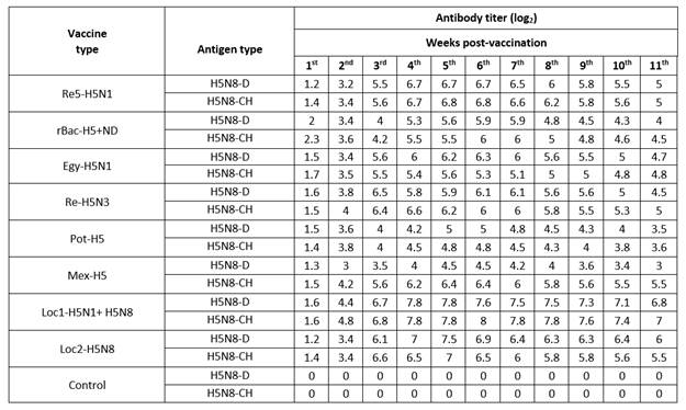 The locally prepared vaccines (loc1-H5N1+H5N8 and loc2-H5N8) induced higher levels of HI antibody titers against H5N8-D isolate reaching 7.8 and 7.5 log2 at 5th wpv; in the case of the H5N8-CH isolate, the HI antibody titer reached its peak at 6th wpv achieving 8 and 6.5 log2 (Table 2). Also, the HI antibody titer against H5N8-D antigen began to decrease from the 6th wpv to reach 6.8 and 6 log2 at the 11th wpv; while for H5N8-CH antigen it started to decline at 7th wpv, to reach 7 and 5.5 log2 at 11th wpv for the two local vaccines, respectively.