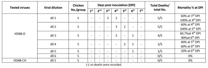 It was done according to World Organization for Animal Health (WOAH)9 for each viral isolate. Serial tenfold dilution (10-1: 10-6) of each H5N8 isolate was done. Each dilution was injected into five SPF chickens, 0.1 mL/bird. Daily deaths were recorded for one week to calculate viral LD50 using Reed and Muench method.8