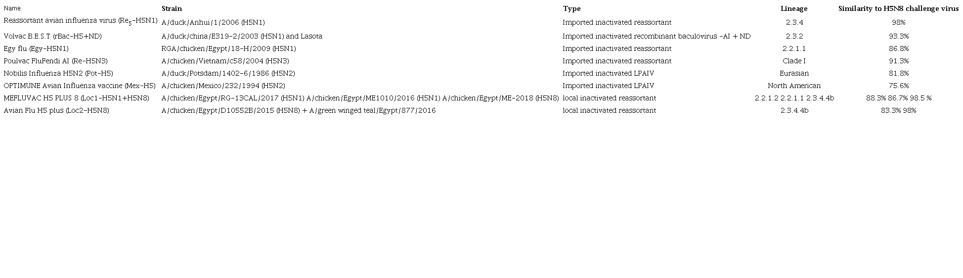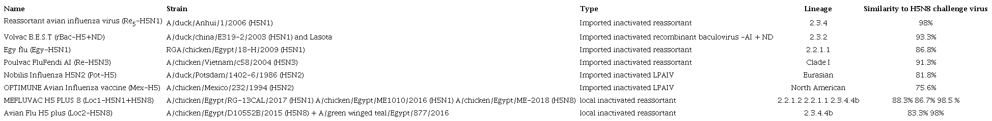 This study was carried out to evaluate the ability of the most recently used licensed commercial inactivated AIV in Egypt (shown in Table 1) to protect chickens against two isolated H5N8 AI virus, as well as the influence of the percentage similarity between the challenge strain and the different vaccine strains on the immune response.