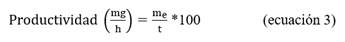 Donde me es la masa eluída de dímero+monómero (mg) y t es el tiempo de operación (h).