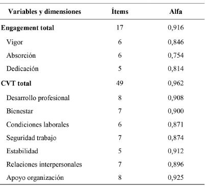 El segundo instrumento es la Utrecht Work Engagement Scale (UWES 17) de Schaufeli et al. (2002) que mide el nivel de engagement de la persona con su actividad laboral, compuesto por 17 ítems organizados en tres dimensiones: vigor, absorción y dedicación, con niveles de confiabilidad sobre 0,70, lo que se considera adecuado (Ávila, Portalanza y Duque, 2017). Las respuestas se organizan, igualmente, en una escala Likert de cinco alternativas que van desde nada de acuerdo hasta muy de acuerdo, con una alternativa neutra (ni acuerdo ni desacuerdo).