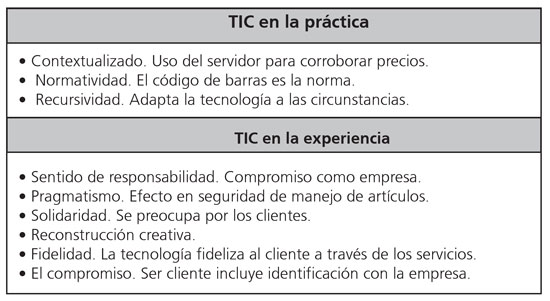 Diferencias. Se percibe diferencia entre TIC en la parte práctica -normatividad- con relación a las TIC, como experiencia -compromiso, lealtad, sentido-, cuyo énfasis va hacia el cliente como individuo.