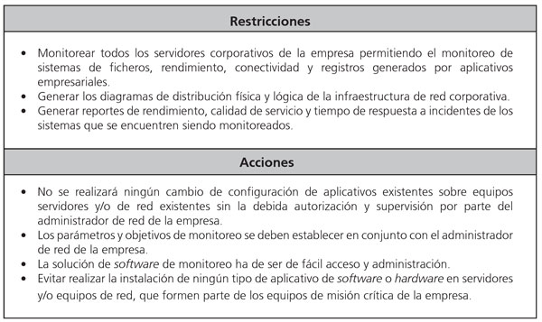 Con el fin de determinar que la implementación sea satisfactoria, diversas necesidades y restricciones se han establecido para cumplir el sistema de monitoreo en la organización, donde este será llevado a cabo. Los lineamientos establecidos por la empresa son los siguientes: