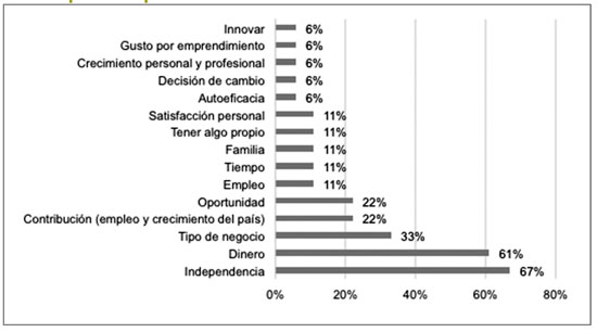 La independencia fue mencionada como factor motivacional por el 67% de los encuestados, ubicándose como el más importante; en segundo lugar, aparece el factor relacionado con el dinero (Figura 3).