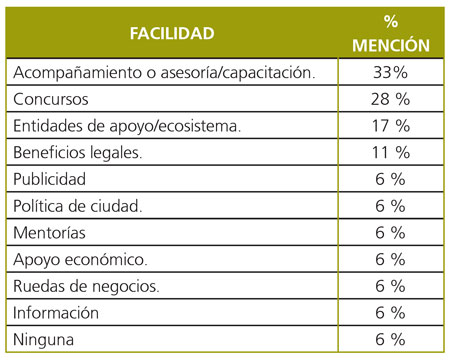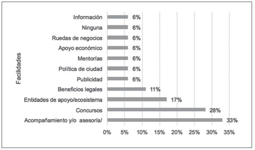 Sin embargo, al indagar por la percepción de las facilidades que ofrece el entorno, y teniendo en cuenta que se trató de una pregunta abierta, se nota que los emprendedores reconocen que se hace un esfuerzo por impulsar esta actividad. El aspecto que ellos consideran más influyente es el relacionado con el acompañamiento que brindan las diferentes instituciones comprometidas con esta labor, ya sea a través de asesoría, contactos o capacitación.