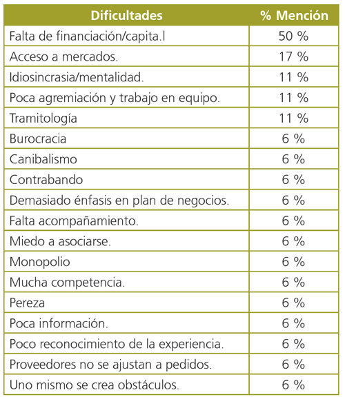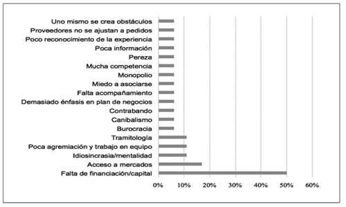 Los aspectos legales tuvieron mención del 11%, tanto en facilidades como en barreras. Este aspecto es el que tiene que ver con las reglas de juego institucionales (North, 2006). Quienes los mencionaron como facilidad se referían a exenciones tributarias, y quienes los consideraron como obstáculo, hacían referencia a que se les exige el mismo volumen de trámites e informes para las distintas entidades estatales, que a las grandes empresas. Esto coincide con la afirmación de Shapero en cuanto a que el efecto principal del entorno político-legislativo-administrativo es negativo (Shapero, 1985).