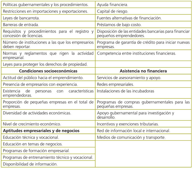 Basándose en esta teoría, Urbano y Díaz (2009) afirman que el entorno institucional en cada región o país será determinante en cuanto a las oportunidades disponibles -empresariales o no-; a la percepción que se tenga de ellas; al desarrollo de habilidades y capacidades para aprovecharlas además de que podrán formar parte de las motivaciones que desencadenan en la creación de una empresa. Gnyawali & Fogel (1994), clasificaron las condiciones para crear empresa en cinco grupos: políticas gubernamentales y procedimientos, condiciones socioeconómicas, habilidades emprendedoras y de negocios, apoyo financiero y asistencia no financiera (Tabla 1).