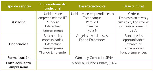 Es de anotar que con los cambios de administración municipal también se han hecho cambios a la política de emprendimiento, es así que ya no existen Ciudad E y Cultura E, como marcas, pero sí las instituciones y programas que las conformaron. A continuación se presenta un resumen de las principales instituciones y servicios relacionados con el fomento a la actividad emprendedora (Tabla 2).
