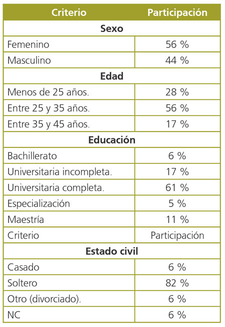 La muestra obtenida está conformada en un 56% por mujeres. Con respecto a la edad, la mayoría de entrevistados se encontraban entre los 25 y 35 años -56%- y un 28% eran menores de 25 años. Por otra parte, el 61% contaba con formación profesional completa y un 17% en proceso de formación universitaria. Finalmente, el 82% de los participantes era soltero. Más adelante, se muestra un resumen de las principales características del perfil de los participantes (Tabla 3).
