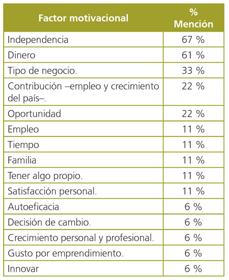 En general, en la decisión de convertirse en emprendedores, en este estudio predominó la motivación intrínseca en el sentido de que esta se origina dentro del sujeto, a través de la autopercepción como persona competente, eficaz y con determinación para actuar, es decir, es el individuo el agente causal de su propia actividad comportamental, tal como lo expuso Barberá-Heredia (2002). De los factores motivacionales externos, se encontró solamente que la oportunidad incidía en el 22% de los casos.