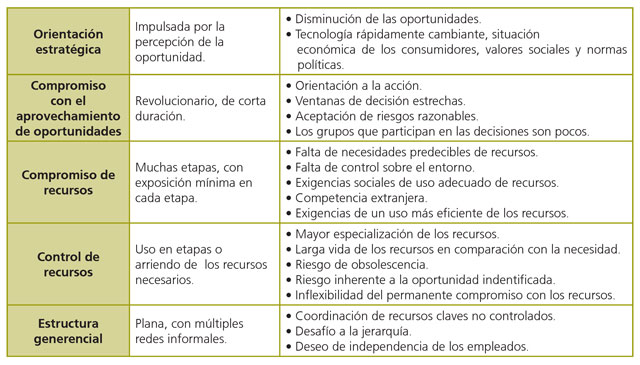 De otro lado, Stevenson (1983) categoriza las dimensiones organizacionales que debe gestionar el emprendedor y caracteriza los retos que este debe asumir. (Tabla 1).