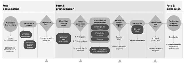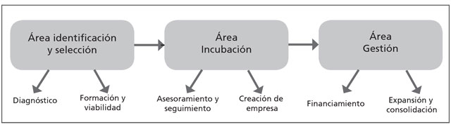 El IN3 buscaba materializar las ideas emprendedoras en planes de negocio susceptibles a ser incubados y transformados en empresas de base tecnológica, a través de tres áreas de operación subdivididas en seis fases de incubación, que permitieron gestionar y viabilizar los planes de negocio de los emprendedores (Figura 1).