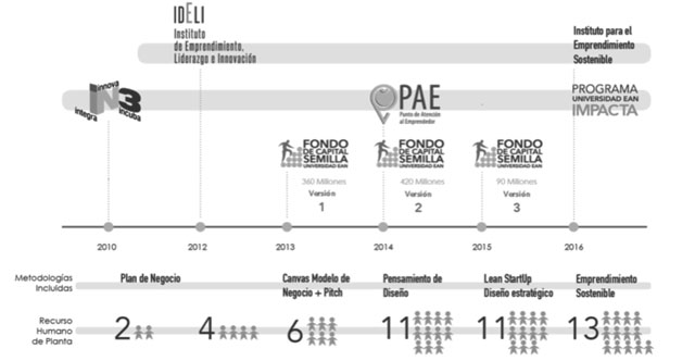 Desde el 2013, con la creación del Instituto de Emprendimiento, Liderazgo e Innovación (IDELI) -actual Instituto para el Emprendimiento Sostenible- y la implementación del Fondo de Capital Semilla de la Universidad EAN, los esfuerzos de acompañamiento del IN3 se transformaron en el PAE, desde el cual se realizó la gestión del Fondo de Capital Semilla y el monitoreo de la ejecución de los recursos asignados. En el otorgamiento de los recursos del Fondo se utilizó el mecanismo de concursos. En las tres versiones del concurso que se realizaron -2013 a 2015- se otorgó un monto de hasta $450 000 000 anuales, concediendo hasta $30 000 000 por año a 15 proyectos de estudiantes y egresados de la Universidad EAN.