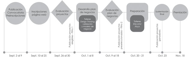 Con el fin de asignar los recursos se realizaron tres concursos en los años 2013, 2014 y 2015, los cuales se fueron mejorando en diversos aspectos, tanto en el proceso de inscripción como en las herramientas para la evaluación. En la segunda versión, para el primer filtro, se utilizó un formato de perfil de negocios -una versión simplificada del plan de negocios usado en la primera versión-; una vez superado este primer paso se desarrollaron talleres grupales sobre pensamiento de diseño y modelo de negocio, con una duración de cuatro horas cada uno, donde se dieron recomendaciones para profundizar el conocimiento del usuario y validar la propuesta de valor. Así mismo, herramientas como el lienzo de modelo de negocio -Canvas- y un simula-lador financiero, para mejorar los perfiles de negocio y completarlos, con el propósito de esarrollar planes de negocio más estructurados y ser evaluados en el segundo filtro.