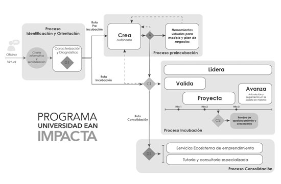 El área de identificación y selección consistía en la inscripción y entrevista personal para la determinación de los requerimientos y necesidades de los planes de negocios inscritos. El área de incubación, por su parte establecía las estrategias de asesoramiento y seguimiento para la creación de la empresa mediante la verificación del cumplimiento de un plan estratégico empresarial plasmado objetivamente en un plan de negocios. El propósito del área de gestión era apoyar a los participantes en la búsqueda de nuevos mercados y de fuentes de financiamiento que apalancaran aquellos planes de negocios que estuvieran en una etapa de maduración avanzada para poder ser sostenibles a largo plazo. Este modelo se convirtió en la base de lo que hoy se conoce como EAN Impacta.
