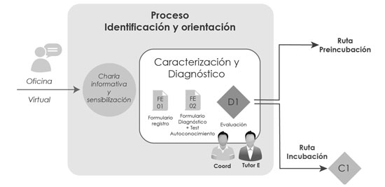 El proceso de identificación y orientación inicia con la inscripción del emprendedor EANista en la base de datos maestra del Instituto para el Emprendimiento Sostenible, que se puede realizar de manera personal o por correo electrónico, para ser invitado a la charla informativa que se realiza mensualmente o se puede ver a través de un enlace web. Posteriormente, el emprendedor debe diligenciar los formularios de registro y caracterización, los cuales permiten diagnosticar si se trata de una idea, un modelo, un plan de negocios o una empresa en marcha. La recepción de estos formatos se hace de manera bimensual. La caracterización permitirá que el coordinador y mentor identifiquen el estado actual del proyecto presentado y emitan un concepto técnico al respecto; este diagnóstico se realiza en el término de dos semanas una vez recibidos los formularios -Diagnóstico 1-D1-. El proceso termina orientando cada caso al siguiente proceso que puede ser: ruta de preincubación, comité de incubación o ruta de aceleración. En total, el proceso de identificación y orientación puede durar uno a dos meses, según el momento en el que el emprendedor realice la inscripción en la base de datos.