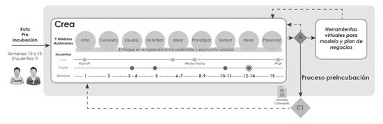La fase CREA se desarrolla a través de un programa de formación y acompañamiento mixto -blended- en donde los emprendedores desarrollan nueve módulos virtuales de manera autónoma, con espacios de socialización con tutores especializados para presentar los avances. Estos espacios se realizan como tutorías virtuales de dos horas, por grupos de tres a cuatro emprendedores, y se realizan en los módulos tres -Análisis de usuario-, cuatro -Síntesis de hallazgos-, siete -Validación- y ocho -Iteración-. En algunos casos se dan dos sesiones de tutoría en el módulo ocho cuando los proyectos realizan varias iteraciones. Igualmente, se establecen espacios de socialización del proceso entre emprendedores para que exista colaboración entre aquellos que están viviendo el proceso. Los espacios presenciales grupales se realizan en los módulos uno -Introducción-, cinco -Ideación-, seis -Prototipado- y nueve -Presentación-.