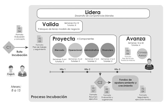 El proceso de incubación inicia con una propuesta de valor validada, la cual permite la definición y aprobación del modelo de negocio en la fase valida. Continúa con la estructuración del modelo de negocio en los temas: comercial, técnico y operativo, organizacional, financiero y de inversión, en la fase proyecta; y finaliza con la implementación del plan operativo y puesta en marcha del emprendimiento, en la fase avanza. Adicionalmente, el emprendedor recibirá herramientas para la reflexión y desarrollo de habilidades blandas, en la fase lidera.