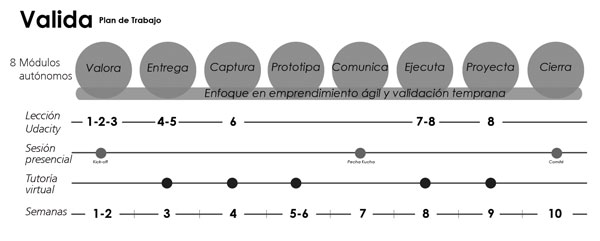 En esta fase del proceso de incubación, el emprendedor formula y valida el modelo de negocio utilizando la metodologías Lean Startup. Se elabora de manera blended, a través del desarrollo autónomo de ocho módulos, que inician con la definición del modelo de negocio y que van guiando al emprendedor en el proceso de validación de cada uno de sus componentes; así mismo, facilita herramientas necesarias para realizar una validación completa y exitosa. Durante este proceso se realizan tres sesiones presenciales grupales -pueden ser cuatro a ocho proyectos- de dos horas, en los módulos uno -valora-, cinco -comunica- y ocho -cierra-. Adicionalmente, se realizan tutorías individuales de dos horas a cada proyecto en los módulos dos -entrega-, tres -captura-, cuatro -prototipa-, seis -Ejecuta- y siete -proyecta-. A estas tutorías pueden asistir los emprendedores de manera virtual o presencial.