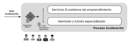 La ruta de aceleración busca articular a las empresas que se encuentren en una etapa de madurez, con mentores y tutores especializados y con los actores del ecosistema pertinentes, de acuerdo con las necesidades de cada empresa detectadas a partir de un diagnóstico empresarial -D2-.