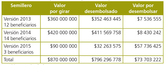 Los recursos asignados y ejecutados en las tres versiones se pueden ver a continuación (Tabla 1). Durante las versión uno y dos del concurso se retiraron tres y un proyecto, respectivamente; argumentaron el retiro por la falta de tiempo para la ejecución del proyecto, lo cual resalta la importancia de evaluar el perfil del emprendedor y no solo del proyecto. Cabe anotar que en la versión 2015 solo se beneficiaron tres proyectos, dado un cambio en la política de asignación de recursos, que fue menor para el año 2015 en capital semilla entregado directamente a los emprendedores para disponer de más recursos para su acompañamiento y soporte. Este cambio se realizó debido a las siguientes razones: a) el rol de la Universidad dentro del ecosistema emprendedor está orientado al fomento y acompañamiento de los emprendedores y a la ejecución de los recursos de capital semilla -su administración y seguimiento contable- desviaba el enfoque de la Universidad; b) existen fondos de capital semilla en el ecosistema con mayor impacto y con estructuras pertinentes y dedicadas a vigilar su ejecución de los mismos; c) el IDELI -actual Instituto para el Emprendimiento Sostenible-, logró gestionar fondos externos para los emprendedores, lo cual es un indicador importante que puede seguir mejorando si el acompañamiento se potencia.