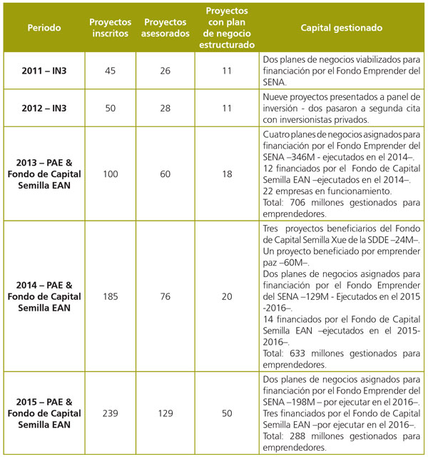 Como resultado del programa, los primeros indicadores en los semilleros incubados entre 2011 y 2012 mostraron una respuesta positiva de la comunidad EANista, teniendo en cuenta la experiencia previa de la Universidad en el trabajo con emprendedores. Las cifras del programa fueron 73 proyectos postulados, de los cuales el 50% lograron llegar a la fase de gestión de financiamientos; de estos, el 10% son empresas creadas o en funcionamiento que han accedido a financiamientos públicos o privados.