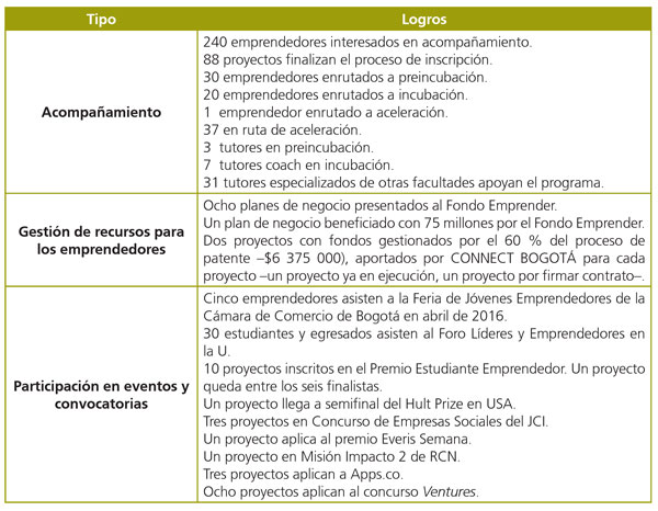 El programa EAN Impacta inició operaciones en febrero de 2016, recibiendo más de 30 proyectos mensuales de emprendedores interesados en el acompañamiento y la gestión de fondos. En seis meses de operación se han realizado cuatro charlas informativas y de sensibilización, donde se ha socializado a los emprendedores, el nuevo modelo, con el fin de alinear expectativas y comenzar el proceso de aplicación y diagnóstico; de esta forma, direccionar a los emprendedores a las diferentes rutas. Adicionalmente, se ha gestionado la participación de los emprendedores en diferentes eventos y convocatorias, logrando la adjudicación de capital semilla en la primera convocatoria del Fondo Emprender, del 2016. A continuación, se detallan los logros obtenidos hasta agosto de dicho año (Tabla 3).