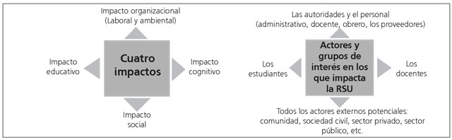 En efecto, Vallaeys (2007), considera que la universidad tiene una responsabilidad con la sociedad, no solo desde sus objetivos misionales, es decir, con la formación académica que brinda, la generación de nuevo conocimiento, la proyección social o extensión, sino también, a nivel interno, desde su incidencia dentro de su misma organización, como generadora de empleo y calidad de vida para sus trabajadores; en a este respeto, las IES impactan, no solo desde la generación de capital humano, sino, desde la gestación de capital social (Vallaeys, 2010). La responsabilidad social de las universidades, más que generar impactos educativos, cognitivos, de innovación o de investigación, genera impactos sociales, así como, organizacionales, que se gestan desde varios actores e inciden en distintos grupos de interés. En tal sentido se distingue un diagrama del autor antes mencionado donde se observa la interacción entre impactos y actores sociales (Figura 1).