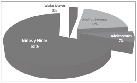De otro lado, la Corporación ha realizado distintas actividades de atención integral, desde convenios con instituciones, como la unidad de víctimas, alcaldías municipales, instituciones educativas, instituciones prestadoras de salud, entre otras. La población beneficiaria de estos programas corresponde a distintos grupos de edad; como balance para el año 2015, la corporación benefició a más de 1200 personas entre niños, niñas, adolecentes, adultos, adultos mayores, e inclusive, grupos de personas con diferentes condiciones especiales -discapacidad física y personas con necesidades especiales de aprendizaje-; sin embargo, su principal grupo de interés externo de atención son los niños y niñas en estado de vulnerabilidad socioeconómica. A continuación, se muestra la participación que tienen los distintos grupos etarios en los programas de atención integral (Figura 2).