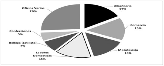 Estas familias tienen bajos niveles educativos, donde la mayoría de los jefes de hogar -85,2%-, tienen, como nivel máximo, secundaria completa, mientras que la mayoría de los conyugues -el 89,2%- llegan también hasta este nivel; en el caso de los hijos, la situación no cambia mucho: el 7,7% de los jóvenes accede a la educación superior. En la mayoría de estos hogares -70,4%- existe una alta dependencia económica, pues solo trabaja una persona que mantiene, en promedio, a tres más: el cónyugue y los hijos inactivos. En el caso de estos últimos, -el 94,4%-, aún se encuentran estudiando. De las personas que trabajan, la mayoría se dedica a labores informales en las cuales predominan las actividades de albañilería y mototaxismo -ejercidas por hombres-; labores domésticas -ejercidas por mujeres-, y ventas en general (Figura 3). Es de destacar que estas personas ocupadas, en su mayoría -87,0%-, desde que trabajan, siempre han ejercido este tipo de actividades; solo el 3,7% tenían actividades netamente agrícolas.