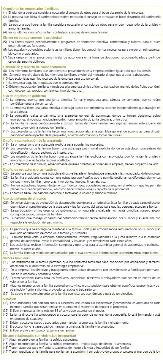El cuestionario recogía el nivel de acuerdo o desacuerdo de los encuestados frente a 47 prácticas de gobierno y gestión (Tabla 1), identificadas a partir de la revisión de literatura y la experiencia previa de los autores, además de la percepción de la unidad y armonía familiar. Esta información se analizó mediante el procedimiento de regresión logística y se encontró que seis factores son los que más influyen en los dos aspectos mencionados anteriormente (Tabla 2).