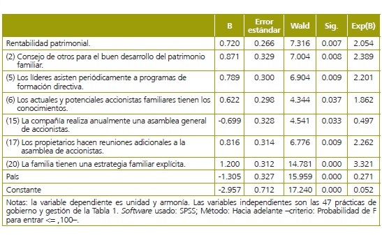 La presente investigación buscó identificar las prácticas de gobierno y gestión que más influyen en la unidad y armonía de las empresas familiares, pues mediante un análisis de regresión logística, se identificaron seis prácticas y dos variables de control que influyen en la percepción de la unidad y armonía familiar. La probabilidad de tener una percepción de mejoramiento en la unidad y armonía es más alta cuando: i) la persona que lidera el patrimonio considera necesario el consejo de otros para el buen desarrollo del patrimonio familiar -2.39 veces-; ii) los líderes asisten periódicamente a programas de formación directiva, conferencias y talleres, para el buen desarrollo de sus funciones -2.20 veces-; iii) los actuales y potenciales accionistas fa-miliares tengan los conocimientos necesarios para ejercer un rol responsable como propietarios -1.86 veces-; iv) los propietarios de la familia hacen reuniones adicionales a la asamblea general de accionistas para discutir periódicamente aspectos de la propiedad, analizar información y tomar decisiones -2.26 veces-; y v) los miembros de la familia tienen una estrategia familiar explícita con actividades que fomenten la unidad y armonía, y que les facilite resolver conflictos -3.32 veces-. En contraste, existe mayor probabilidad de tener una percepción de deterioro en la unidad y armonía cuando la compañía realiza anualmente una asamblea general de accionistas donde se toman decisiones sobre inversiones, dividendos, endeudamiento, nombramiento de junta directiva, entre otros -.50 veces-. Los hallazgos anteriores dieron sus-tento a la hipótesis planteada y se corroboró que algunas prácticas de gobierno y gestión implementadas en la empresa familiar influyen en su unidad y armonía.
