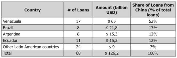 Since 2005, China has been constantly lending money to Latin America, despite China's economic slowdown; most of the funds went to Argentina, Brazil, Ecuador and Venezuela. These four countries have received about 93% of China's loans to Latin America, 81% of the loans come from the China Development Bank and the 19 % remaining from the China Export-Import-Bank. According to Gao and Yu (2011), these financial movements reflected Chinese leadership strategy to internationalize the Yuan Renminbi (CNY). Additionally, it was used to create a financial integration with the region like it happened in ASEAN5 countries with the Chiang Mai Initiative (Figure 5; Table 2; Table 3).