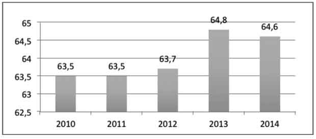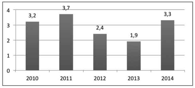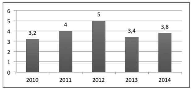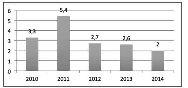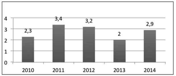 El índice de precios al consumidor ha sido fluctuante, solo en 2012 y 2013 ha tenido valores inferiores a 2.5, mientras que en 2010, 2011 y 2014 su valor supera los tres puntos. La tendencia alcista en estos últimos cinco años está liderada por educación y seguida de salud, comunicaciones y viviendas. En los que menos variación han sufrido, se destaca esparcimiento, seguido de vestuario y transporte, que se mantienen bajos (Figura 3).