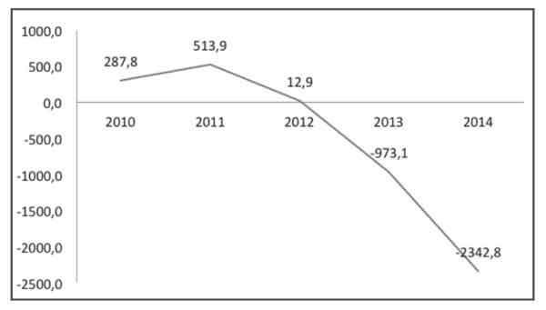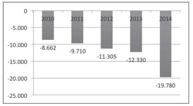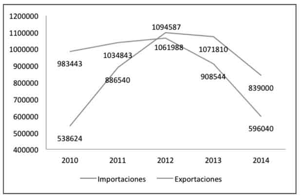 En cuanto a la balanza comercial del sector textil-confección, se encuentra que las importaciones tienen un aumento brusco a partir de 2010 hasta 2012, con el débil crecimiento de las exportaciones que bajan abruptamente en 2013, pasando de una balanza comercial con superávit a déficit. Las razones, entre otras, están dadas por el cambio de arancel para materias primas en las importaciones, el crecimiento de la demanda interna no satisfecha por la producción nacional y la depreciación de la moneda a partir de la crisis económica de 2008 que abarató las importaciones y bajó la competitividad desestimulando las exportaciones. Esta situación fue motivo para imponer la medida de protección al sector en medidas arancelarias (Figura 10).