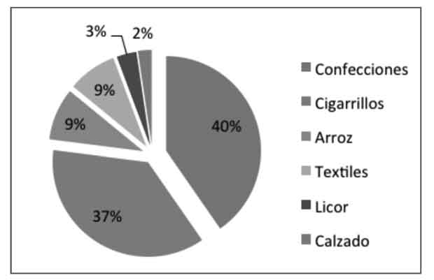 En Colombia, el contrabando técnico medido con la técnica espejo, es decir, por las importaciones que se registran por país contra las exportaciones registradas en ese país (DIAN, s.f.), proviene de los Estados Unidos alrededor de 30 % en los últimos cinco años, seguido de China con cerca de 14 % y México con aproximadamente 12 %. En lo que se refiere a las incautaciones de contrabando (DIAN, s.f.), oscilan entre COP 70 000 millones y COP 80 000 millones, especialmente en la industria textil-confección que representa 49 % del total (Figura 11).