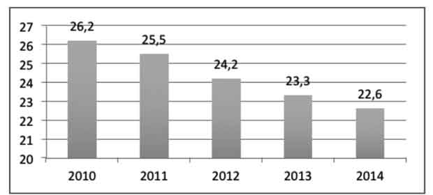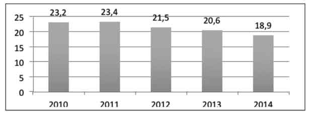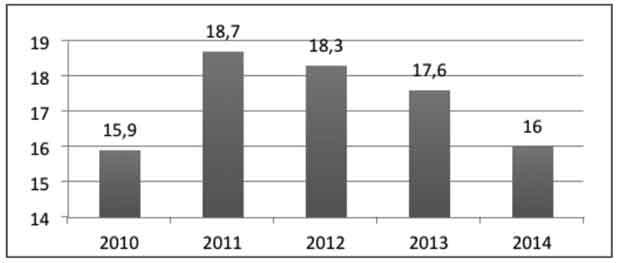 China es potencialmente exportadora, es el primer proveedor del mundo si se toman las cifras en valores. Fue una política de los planes quinquenales anteriores y se mantiene en el vigente. Aunque los anteriores planes consideraban mantener una baja tasa salarial que ponía en desventaja a los demás países y que volvía la economía china más productiva dado su número de personas en etapa productiva y la baja demanda interna, convirtieron a China en el exportador detalla mundial que es actualmente. En este quinquenio, las exportaciones muestran una tendencia a la reducción si es vista en el porcentaje del PIB que representa, pues en 2010 significaba 26.5 % y en 2014 significó solo 22.6 %, lo cual se explica por factores como la desaceleración económica, la apreciación del yuan y, en cierta forma, por su política enfocada a aumentar el consumo interno a partir del último plan quinquenal con el aumento en la tasa salarial y grandes planes de inversión en infraestructura (Figura 15).