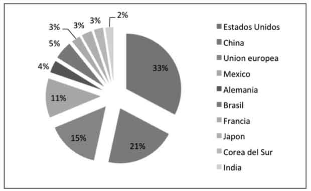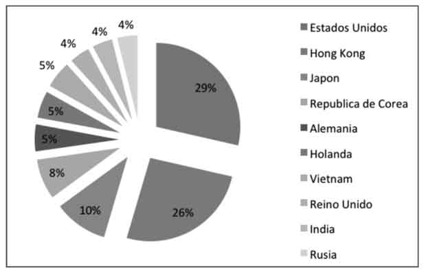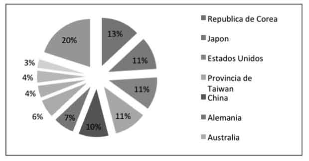Sus exportaciones provienen básicamente de la República de Corea, Japón, los Estados Unidos, Taiwán, reimportaciones chinas y de Alemania (Figura 14).