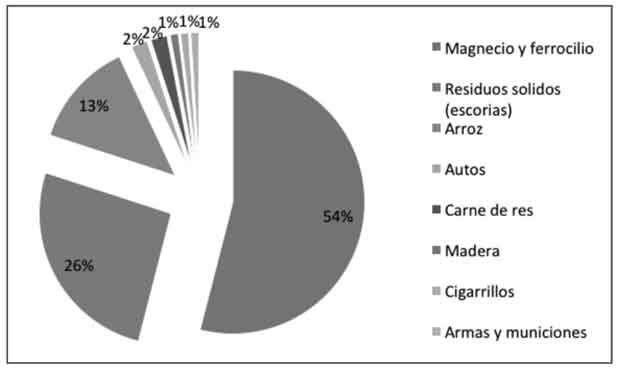 China se destaca en este aspecto por tener políticas fuertes frente al contrabando, cuyo delito es severamente castigado. El contrabando de armas y dinero falso será hasta noviembre de 2015 un delito castigado con pena de muerte, cuando entre en vigencia la reforma penal y el contrabando técnico sea objeto de fuertes sanciones penales y económicas. Se presenta, sobre todo, en minerales y residuos sólidos de industria, como polvos y escorias, seguido del sector agropecuario encabezado por arroz y carne. El contrabando contribuyó a la baja en el IPC durante 2012, 2013 y 2014, sobre todo, en los precios de los alimentos por el volumen de contrabando. En China, a diferencia de Colombia, por ser fuerte en la industria textil y confección, el contrabando en este sector tiende a cero, pues, aunque recibe contrabando sobre todo de confecciones con pieles exóticas y otras, su volumen es bajo y no afecta mayoritariamente su industria, como sí lo hacen los minerales y los residuos sólidos que representan más de 80 % del total (Figura 18).