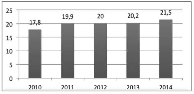 En cuanto al comportamiento, en 2011, se puede apreciar un salto importante marcado por la demanda de petróleo en el mercado internacional y por el crecimiento económico del país; sin embargo, tras subir tres puntos porcentuales inicia un descenso leve que ha llevado a perder lo ganado y que se explica por la desaceleración de la economía china, los síntomas de debilidad en la economía interna y por el fin de la bonanza en la demanda de materias primas en el mercado internacional. La fuerza en la demanda interna ha hecho que sectores como el de textil confección destinen parte de su producción a suplir esa demanda interna y a enfocarse en arrebatarle el mercado ganado por la competencia internacional (Figura 6).