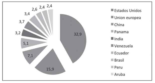 Su principal socio comercial en exportaciones sigue siendo los Estados Unidos. La Unión Europea se posiciona en segundo lugar gracias a un importante crecimiento en la demanda favorecido por el TLC que permite el ingreso de productos con arancel cero. China se ubica en tercer lugar por la demanda de petróleo, desechos de cobre, cueros, desperdicios de aluminio y carbón. Panamá registra también un importante crecimiento por la demanda de petróleo que constituye más de 70 % del comercio. Venezuela queda lejos de ser el segundo socio comercial en el mercado natural que se truncó con la compleja situación diplomática de 2008, y se ubica sexto, en parte por la demanda de alimentos que ha generado la situación de dicho país; caso contrario, la relación comercial sería menor (Figura 7).