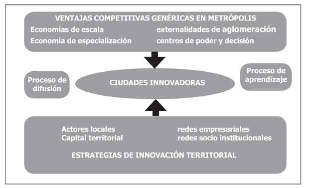 De acuerdo con lo anterior, es evidente que las ciudades, y en especial las de mayor tamaño, tienen unas actuaciones innovadoras que se diferencian y que se caracterizan por su territorialidad, como desarrollo histórico; esto se incorpora en el análisis de la actividad económica metropolitana, lo cual supone hacer complementarias y compatibles dos tipos de argumentación (Figura 2).