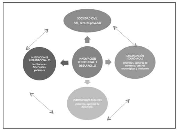 Las instituciones públicas son todas las autoridades y administraciones que tienen poder sobre el territorio y un marco descentralizado -territorial-, por ende, actores y conocedores del enfoque de desarrollo propio, lo cual las hace protagonistas de primera línea; también las instituciones nacionales, internacionales y supranacionales tienen un papel en el proceso innovador y de desarrollo. Las instituciones privadas, entre ellas, las empresas, las organizaciones, los centros tecnológicos, entre otras, actúan como dinamizadoras de iniciativas colectivas de carácter local.