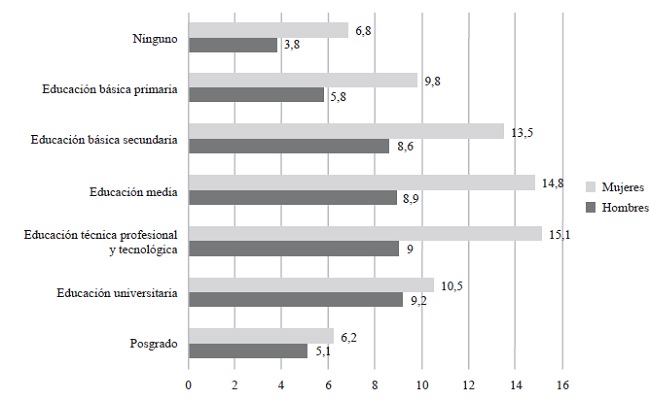 Se muestra a nivel nacional para 2016 la tasa de desempleo según el nivel educativo logrado y el sexo, en la cual se evidencia que la mayor tasa de desempleo se registra en las mujeres sin importar su nivel educativo (Figura 1). De esta forma, el porcentaje de desempleo de las mujeres que tiene formación en educación media -grado once- se encuentra en el 14.8 %, a diferencia del porcentaje de desempleo de los hombres que es del 8.9 % con el mismo nivel educativo; las mujeres sujeto de estudio, al verse sin oportunidades de empleo, se ven en la necesidad de buscar a como dé lugar ingresos que cubran sus necesidades básicas de alimentación, salud y vivienda para ellas y sus familias. Esto tiene efectos en su vida y grupos familiares, ya que son los que más niveles de pobreza pueden registrar.