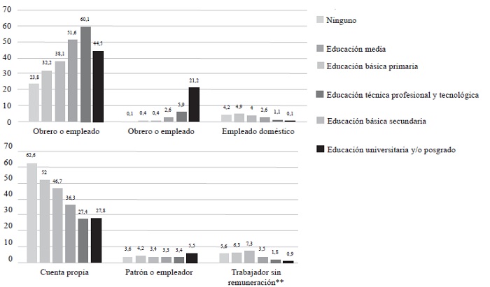 Se presenta la distribución porcentual de ocupados según su posición ocupacional en 2016 como empleados particulares, empleados del Gobierno, empleados domésticos, trabajadores por cuenta propia, empleadores, trabajadores sin remuneración (Figura 2). Así, los mayores ocupados obedecen a los trabajadores por cuenta propia que buscan en su entorno actividades laborales que les permitan conseguir ingresos sin tener ningún nivel de estudios, los empleados que le siguen con mayor porcentaje de ocupación laboral son los obreros o empleados particulares que cuentan con educación técnica, profesional o tecnológica, los empleados del Gobierno que tienen mayor ocupación son los que poseen educación universitaria o posgrado y un empleado doméstico no requiere mucha formación para ser contratado. Por su parte, los empleados domésticos más ocupados son los que poseen educación básica primaria; los porcentajes en los niveles de educación para un patrón o empleador no varían mucho, un patrón o empleador puede no tener ninguna formación o puede poseer posgrado, rangos que se encuentran entre el 3.3 y 5.5 %.