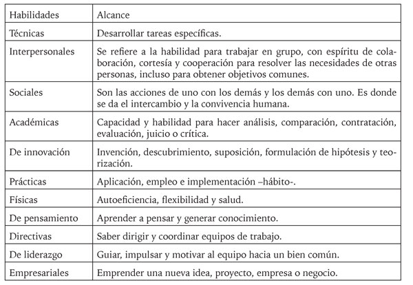 Según Madrigal (2002), hay diferentes clases de habilidades que le permiten a un directivo lograr un mejor desempeño, tales como entender, desarrollar y aplicar habilidades interpersonales, sociales y de liderazgo, en tanto que las otras habilidades que se presentan son complementarias, lo cual llevará al directivo a contar con un perfil ideal para su desempeño. A continuación, se relacionan las habilidades directivas planteadas y su alcance (Tabla 1).