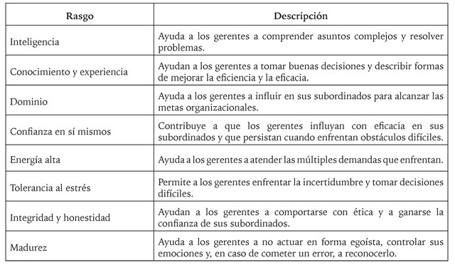 Las acciones emprendidas por los seres humanos sin importar su finalidad son realizadas de acuerdo con las habilidades poseídas por cada uno, las cuales permiten que un individuo descubra oportunidades, persiga iniciativas que generen ingresos propios y procuren el desarrollo de una sociedad, entre otros. Las habilidades gerenciales reflejan actitudes de liderazgo, y en este sentido Jones y George (2014) identifican los rasgos y las características personales relacionados con un liderazgo eficaz (Tabla 2).