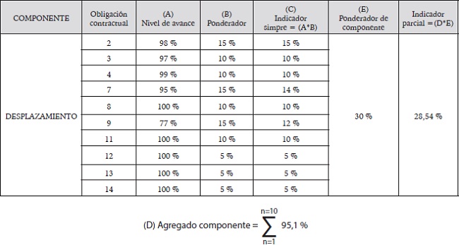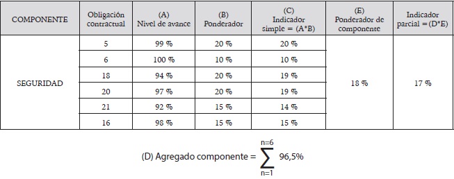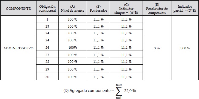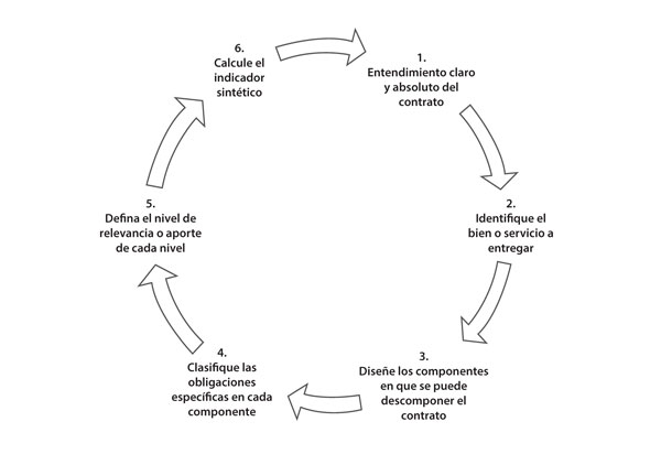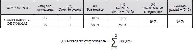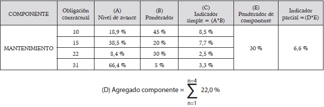 Mediante el IAC se cuenta con una nueva herramienta que permite hacer uso de las buenas características aportadas por las técnicas existentes, al tiempo que se contrarresten las desventajas o debilidades que presenta la atomización de obligaciones de un contrato. Para ello, a partir del seguimiento al cumplimiento de cada obligación, se obtiene un conjunto de indicadores simples II, 12, In. Para poder hacer uso de estas observaciones de la forma más óptima posible, en un primer paso tendremos que convertir todos nuestros indicadores simples en indicadores del tipo «parcial», esto es, agregaremos de manera ponderada las calificaciones de avance según el componente. Una vez realizadas estas consideraciones, se calcula el nuevo indicador sintético.